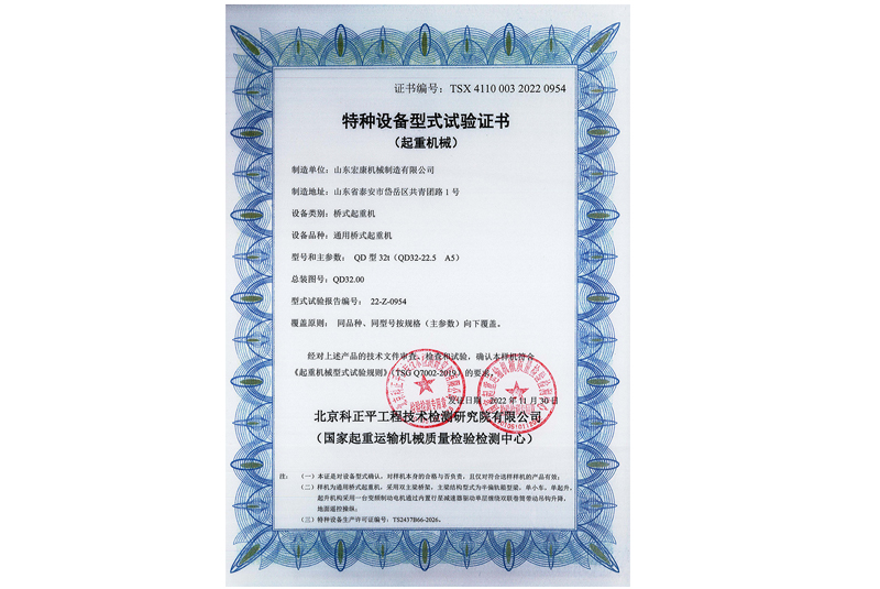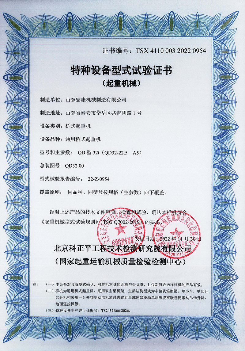 通用桥式起重机(双梁)型式试验合格证