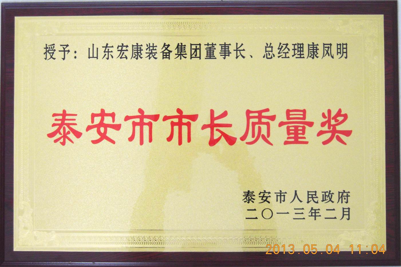 近日,泰安市人民政府下发《关于表彰奖励2012年度泰安市市长质量奖获奖单位和个人的通报》(泰政函【2013】15号)文件,集团董事长、总经理康凤明被授予2012年度“泰安市市长质量奖”,并受到奖励。
